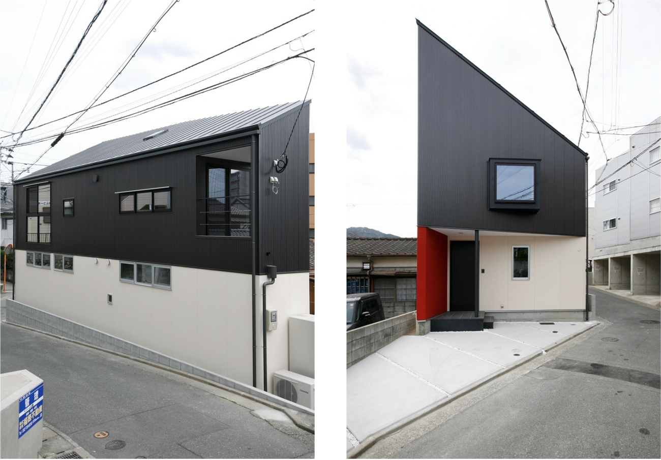 地下鉄七隈駅徒歩3分の変形地に建つ木造2階建て狭小住宅です。