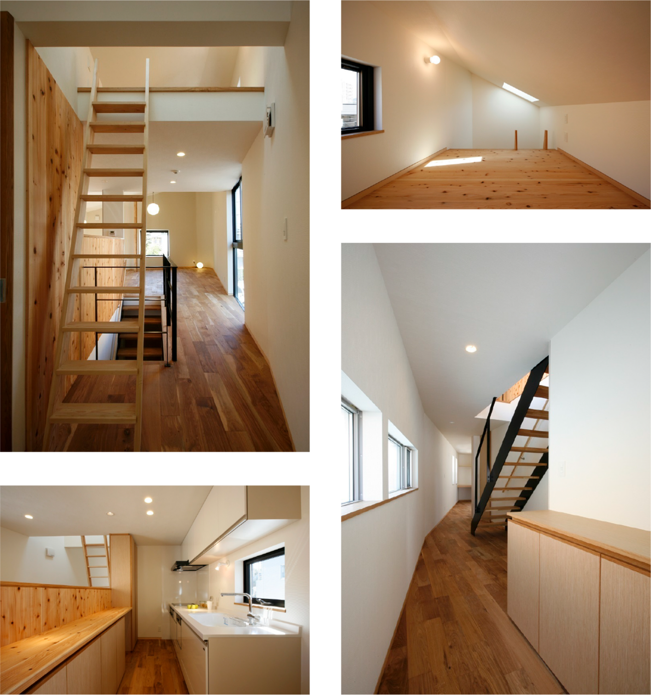 建築基準法や、施工的に許される最大限のボリュームを目一杯利用した狭小ローコスト住宅です。ローコストでありながらも自然素材を多用して手触りの良い仕上げとしています。高い天井高や大きな引戸等を上手く利用し、空間が途切れない工夫をして、広がりと開放感を与えています。