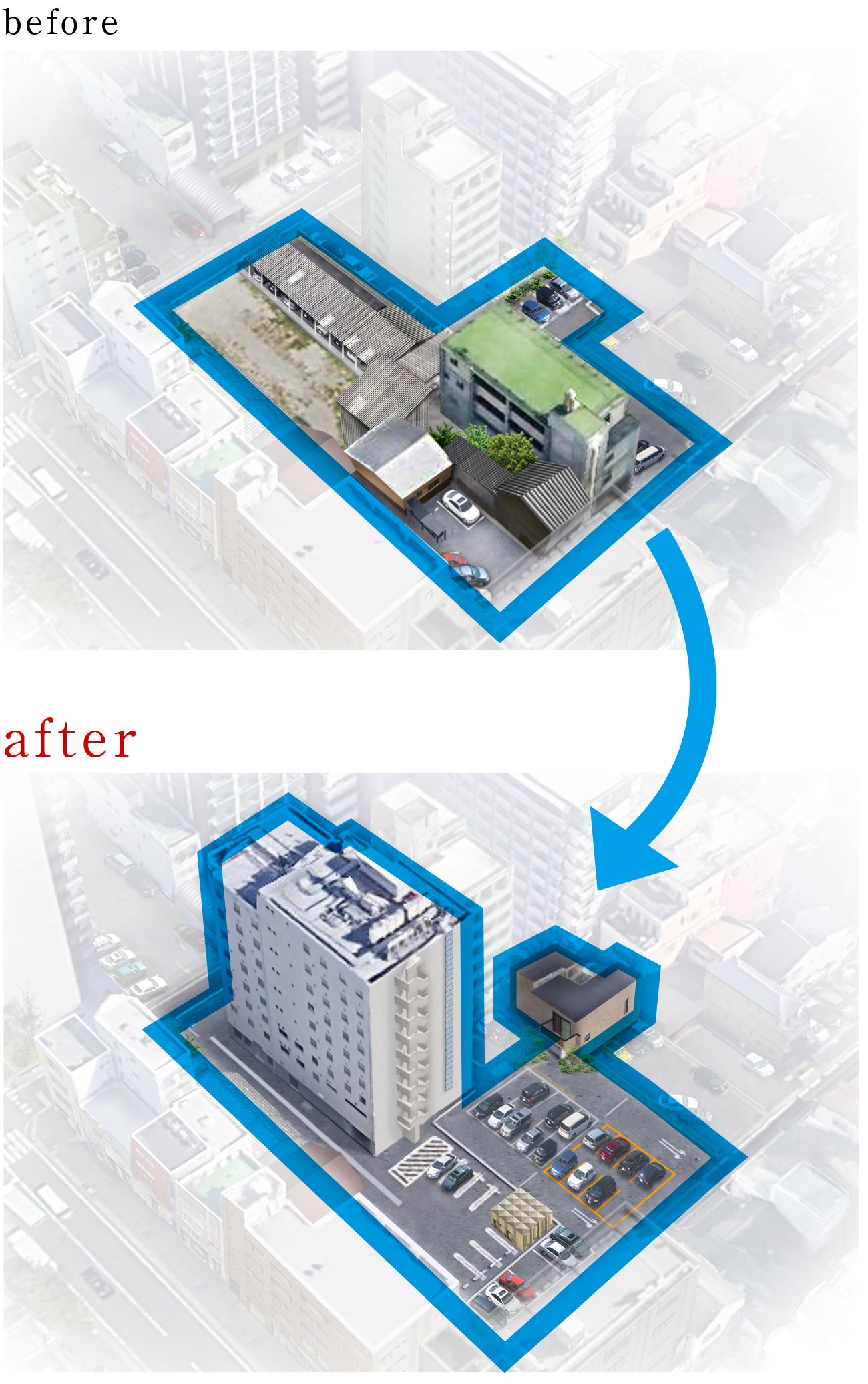 複数の企画提案を行い、最終的に隣地と合わせてホテルを開発する企画案で、ホテルを誘致し長期の賃貸借契約にて安定収入を確保しました。またこれにより所有敷地の半分をホテル敷地及びその駐車場として利用し、残り半分を月極駐車場、コインパーキング、お客様の自宅等として利用し、低稼働不動産が高収益物件に生まれ変わりました。