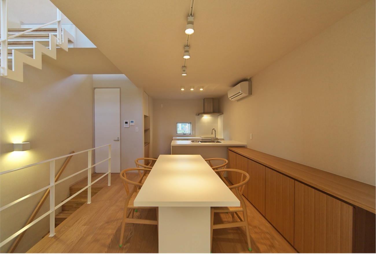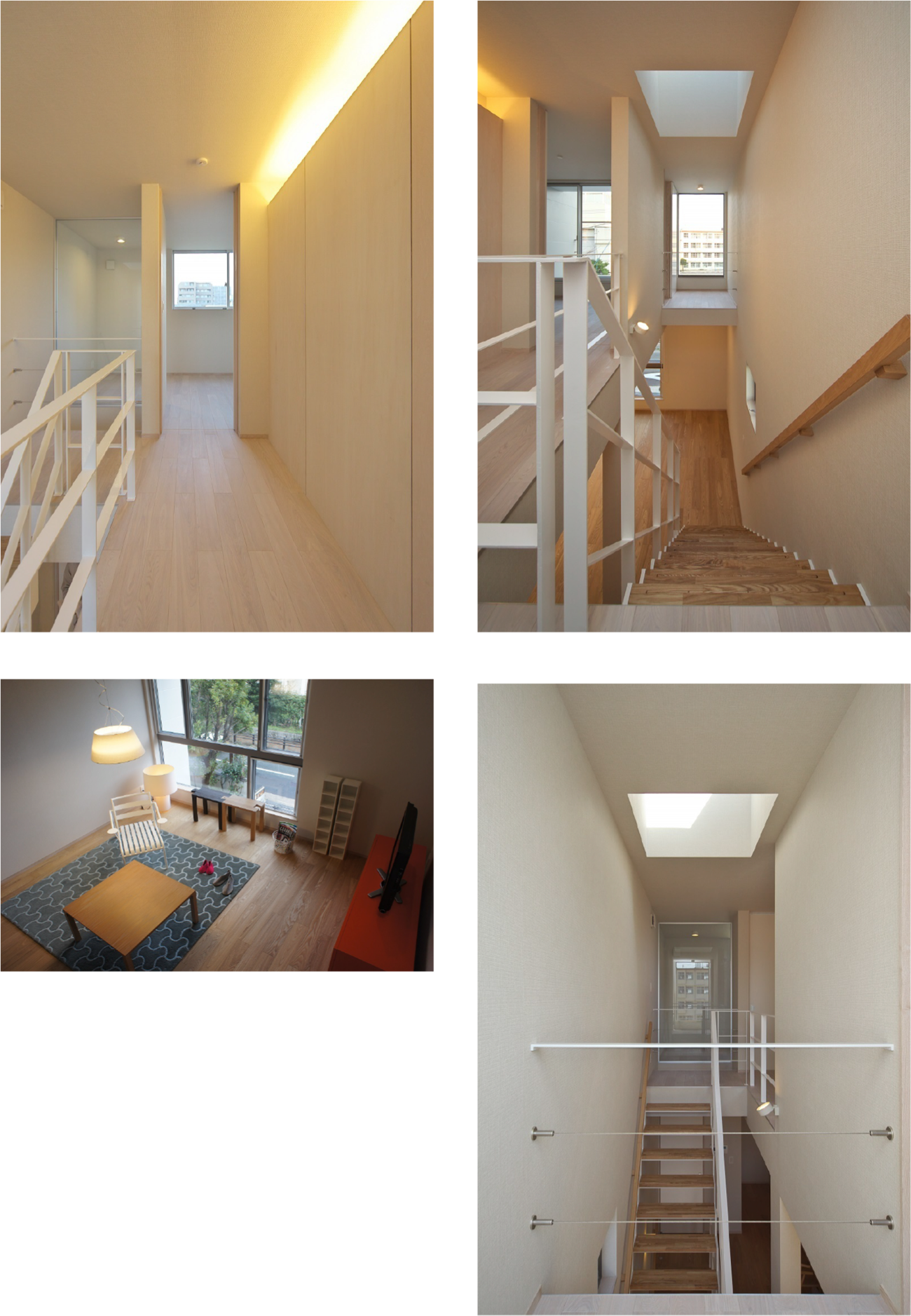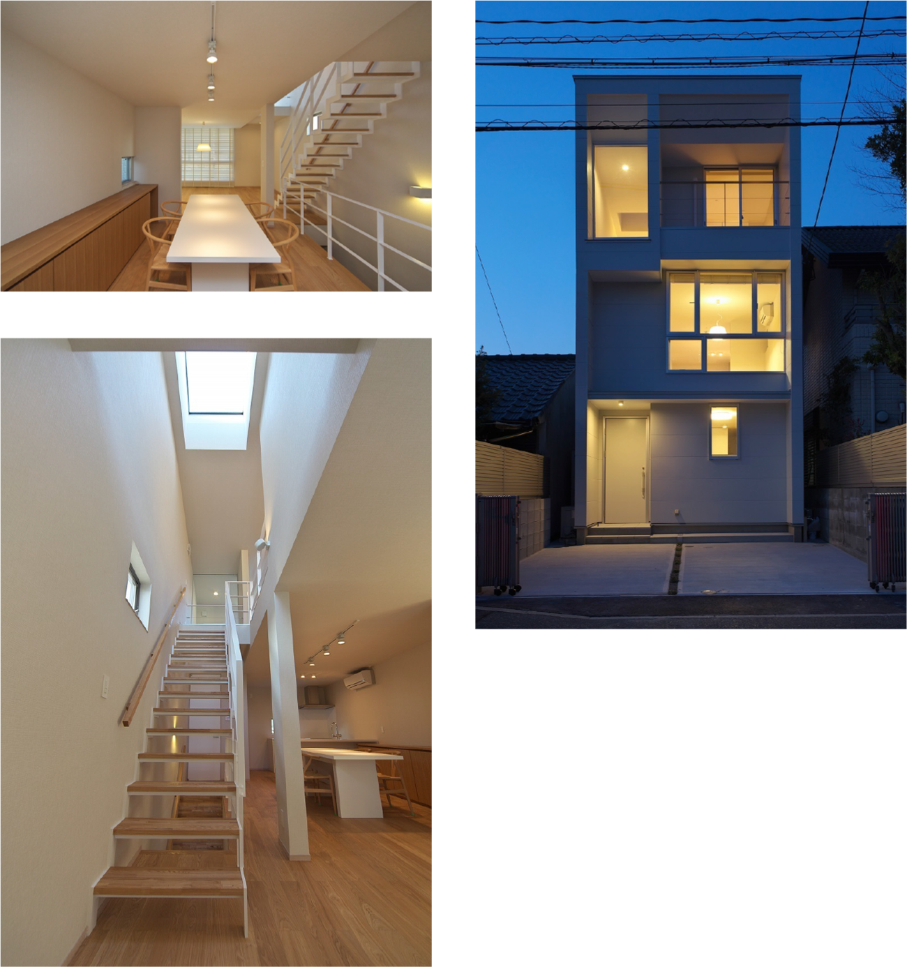 3方建物に囲まれた、狭い間口の敷地に建つ3階建ての狭小住宅。間口が狭いため、高さ方向に展開していく空間構成として広がりと豊かさを演出しています。あまり主張しすぎないシンプルなデザインの箱型の家とし、遠方の景色や緑を借景として美しく室内に取り込みます。階段室の吹抜けを活かして上部のトップライトより3層に渡り光を落とし込みます。1階に主寝室と水回り、2階にリビング・ダイニング・キッチン、3階に2つの個室と書斎コーナーやルーフバルコニーといった空間構成です。