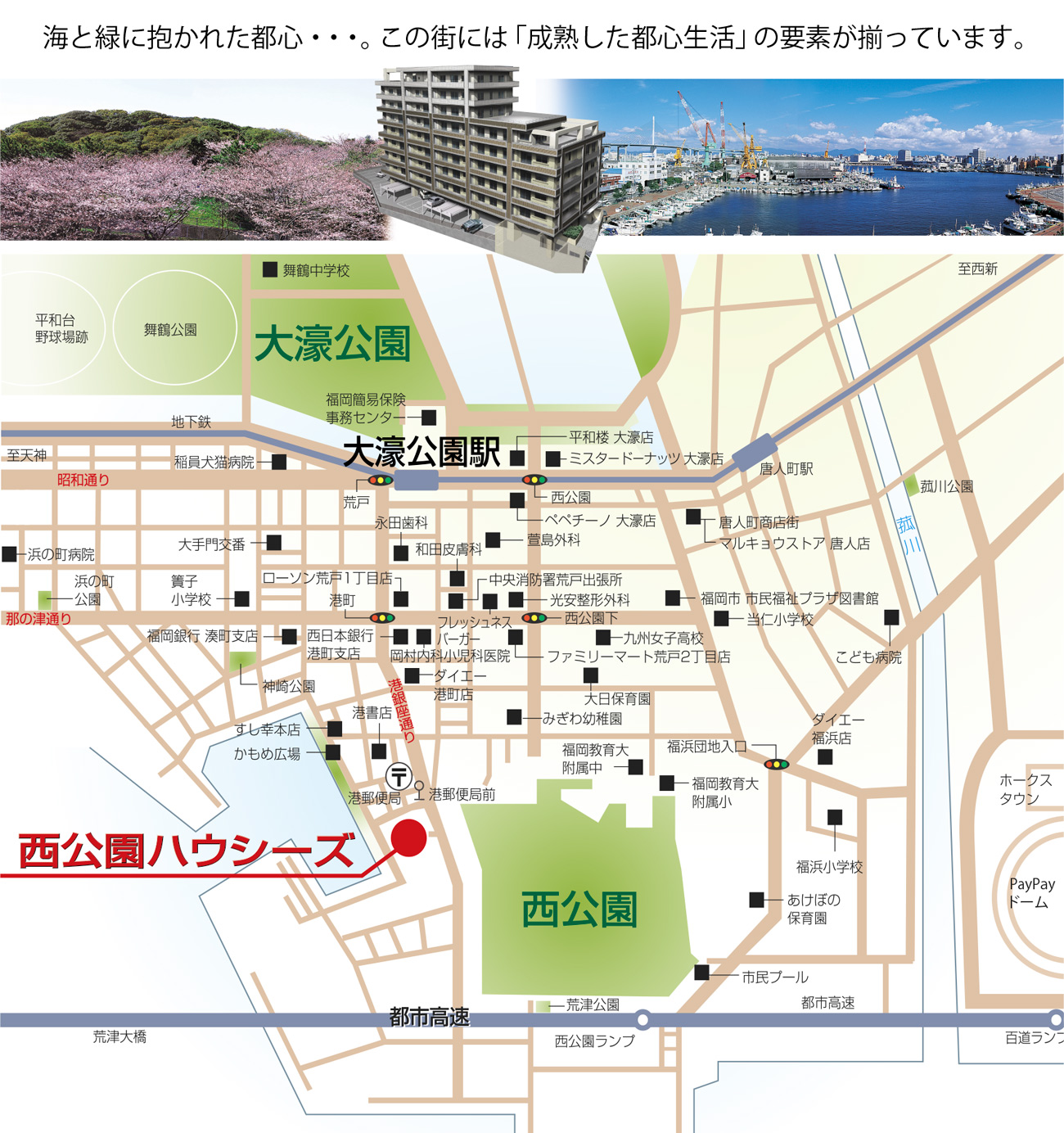 “都市と自然の共生”が求められる現代で集合住宅にはデコラティブな華やかさより存在を主張しすぎない「風景にとけこむ美しさ」が、必要なのではないでしょうか。西公園ハウシーズのデザイン・コンセプトは、“シンプルで、ナチュラルであること”。天然の風合いが薫る部材にこだわって、飽きのこないデザインを随所に施しています。例えば、温かみのある石畳のアプローチ。しっとりと落ち着いたエントランス・・・このニュートラルな空間は、歳月を追うごとに親しみを増す“ぬくもり”を醸し、全ての「住まい手の個性」を迎え入れる準備を整えています。
