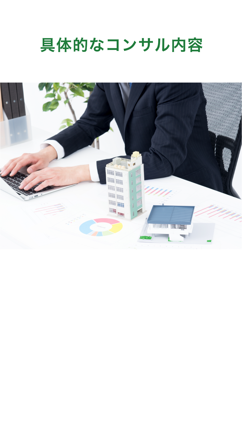 不動産コンサルティングの核となる業務は、不動産自体のポテンシャルや地域性のほか、土地所有者の思いや考え方から見えてくる土地有効利用の目標・目的(コンセプト)を探索・策定し、実際にこの土地で、どのように具現化するかを企画としてご提案する事です。