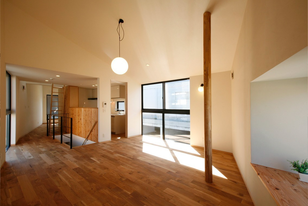 建築基準法や、施工的に許される最大限のボリュームを目一杯利用した狭小ローコスト住宅です。ローコストでありながらも自然素材を多用して手触りの良い仕上げとしています。高い天井高や大きな引戸等を上手く利用し、空間が途切れない工夫をして、広がりと開放感を与えています。