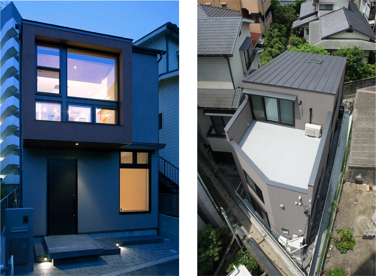 けやき通り徒歩1分の立地に建つ、木造2階建て狭小住宅です。