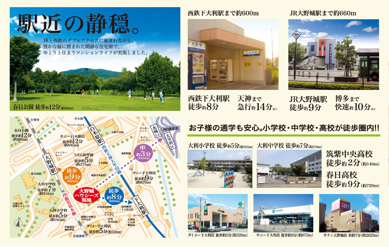 JRと西鉄のダブルアクセスに恵まれながら、豊かな緑に囲まれた閑静な住宅街で、ゆとりと住まうマンションライフが実現しました。