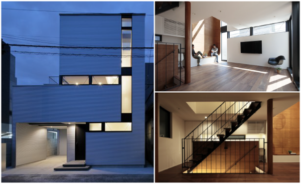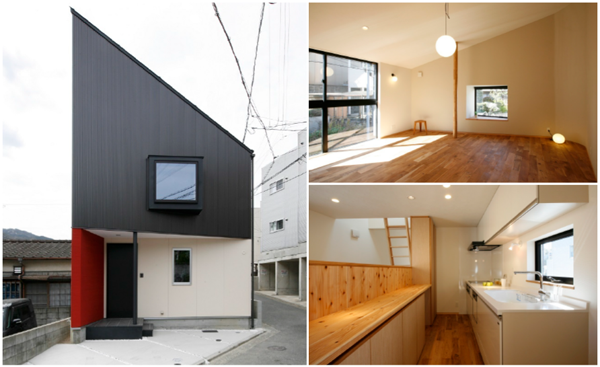 建物を建てることが出来なかった通路に面した、福岡市中心部の木造2階建て(3層スキップフロア)狭小住宅