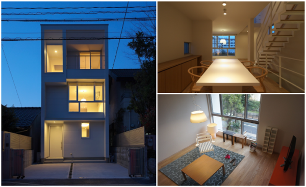 狭い間口の敷地に建つ木造3階建ての狭小住宅