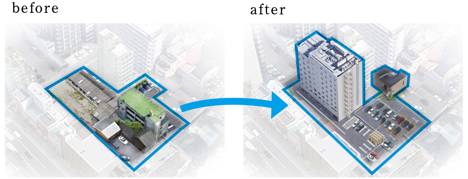 ※この企画には、土地の等価交換手法を用いて、敷地の再配置で不整形な土地を是正して高度利用しやすくすることにより、資産価値を上げるという効果も期待できます。