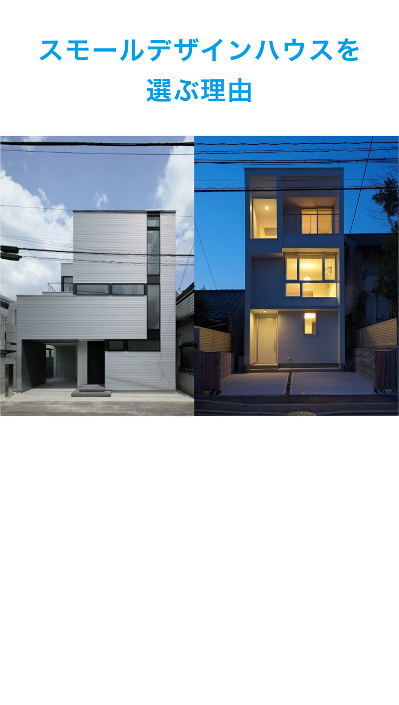 大きな壁に囲まれた立地は都心部では珍しくありません。こういった土地で気になるのが「採光」です。隣の集合住宅などからの目線を区切りつつ、スキップフロアや吹抜を採用し、狭さを感じさせず、採光や風通しを良くするための設計が重要になります。独自のノウハウによるスモールデザインハウスを提案しています。